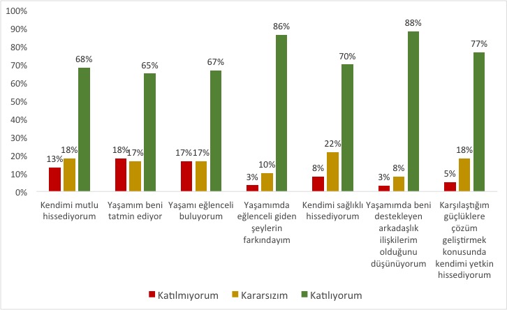 Benim katılımcılarımın % 68’i kendilerini mutlu hissettiklerini söylediler. Biraz alt başlıklara bakınca, kadınlar erkeklere göre daha mutlu, daha sağlıklı, daha fazla arkadaş ilişkisine sahip ve güçlüklere çözüm üretme konusunda daha yetkin hissettiklerini belirttiler. Erkeklerse, yaşamı eğlenceli bulma konusunda daha yukarıda bir sonuca sahipler. Evlilerin tüm parametreleri bekarlara göre daha yüksek çıkarken, 40 yaş üzeri katılımcılar, daha gençlere göre tüm parametrelerde daha yüksek memnuniyet belirttiler. Benim basitleştirilmiş anketim, zorluklara bakış açısının, arkadaş ilişkilerinin, yaşama daha ileri bir yaştan bakmanın ve yaşamı birileri ile paylaşmanın mutluluk diye tanımladığımız şey her neyse onun üzerinde olumlu etkisi olduğuna yönelik ipuçları verdi ve aslında bu konuda söylenenleri de destekledi diye düşünüyorum. Bildiğim bir şey daha kısa anketim tarafından desteklendi, o da mutluluğu tanımlar mısınız dediğimde yapılan tanımların birbirinden ne kadar da farklı olduğu, yani mutluluk dediğimizde aslında en yakınımızdaki insanla bile aynı şeyden bahsetmiyor olabileceğimiz hali :)