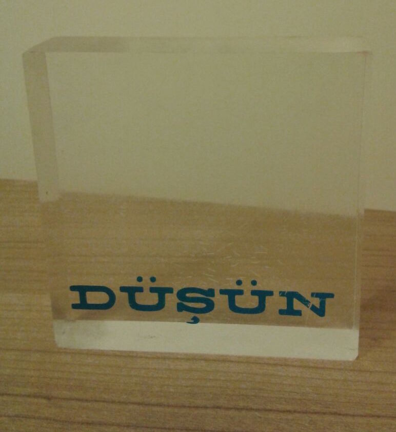 Ben çok küçükken babam masamın üzerine koymam için şeffaf bir oyuncak vermişti bana, üzerinde DÜŞÜN yazan şeffaf bir oyuncak. Oyuncak diyorum, çünkü küçüktüm ve ben onu oyuncak olarak yaşamıma dahil etmiştim, çünkü o zamanlar ne kadar anlamlı bir oyuncak olduğunun farkında değildim, sadece bir oyuncaktı benim için. Büyüdükçe anlamını keşfettiğim bir oyuncağa dönüştü. Şimdi hala çalışma masamın üzerinde duran bu oyuncak bana yaşamdaki en önemli aktivitenin düşünmek olduğunu hatırlatan en önemli hatırlatıcımdır.