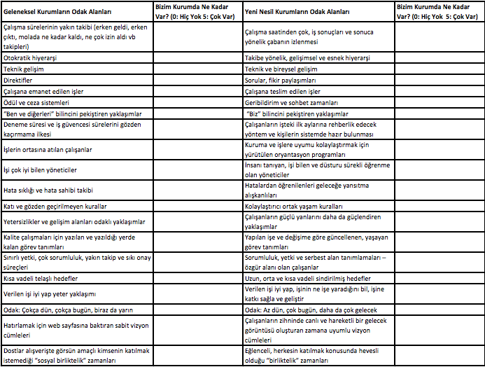 (Geleneksel ve yeni nesil odağı ile ilgili tam iki ucu yerleştirmeye çalıştım soru tablosuna, çünkü, ancak iki radikal uçtan bakınca daha net anlaşılıyor yeni nesil ve geleneksel şirket yaklaşımlarının birbirinden ne kadar farklı oldukları. Siz de kutucuklara yazdığınız sayılara bakarak, kendi kurumunuzu hızlı bir değerlendirmeden geçirebilirsiniz diye düşünüyorum.)