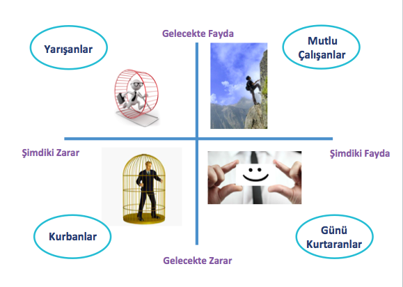 Tal Ben Shahar mutluluğa bakışı 4 farklı alanda tanımlıyor. Mutluluk çalışmalarım sırasında onun bu tanımlamalarını kurumsal yaşamdaki çalışanlara tercüme ettim: Yarışanlar, Kurbanlar, Günü Kurtaranlar, Mutlu Çalışanlar. Her birine biraz detaylı bakalım.
